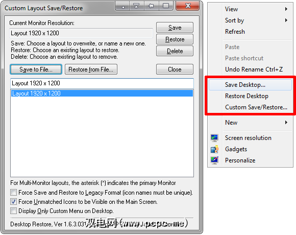 Desktop Restore会记录所有桌面图标的确切位置,并允许您进行还原布局,如果您的图标变得混乱。该工具集成在桌面右键菜单中。您可以轻松保存和还原当前布局。通过自定义布局保存/恢复菜单选项,您可以在具有不同桌面分辨率的布局之间进行切换,以及将布局数据保存到文件中或从文件中恢复。