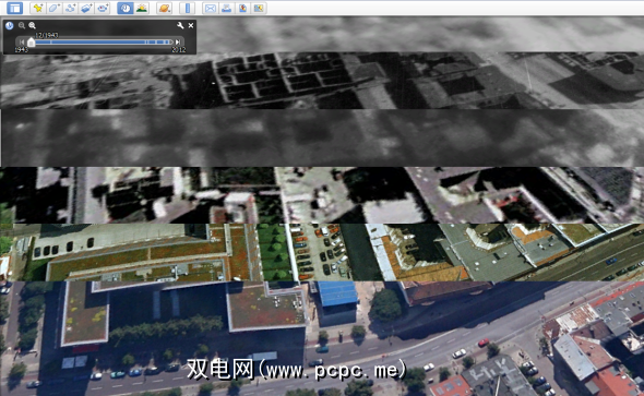 上面的Google Street View图片是2010年的。此后,这里发生了翻天覆地的变化。有时,您可以通过在Google Earth中启用历史图像来跟踪地点的发展。点击卫星图像上方导航窗格中的“返回时间"按钮。对于上面的柏林场景,档案中包含了1943年至2012年的卫星图像。
