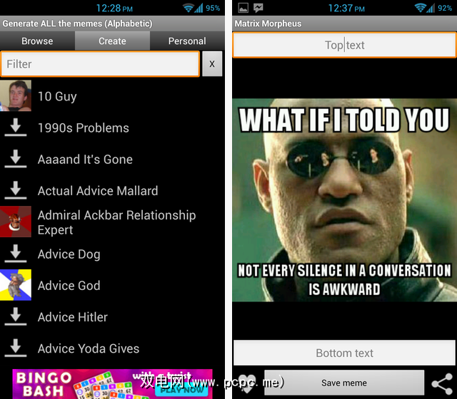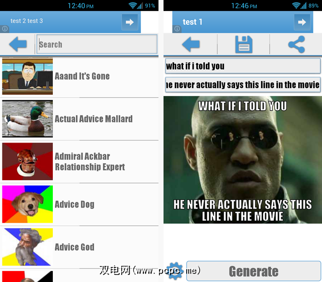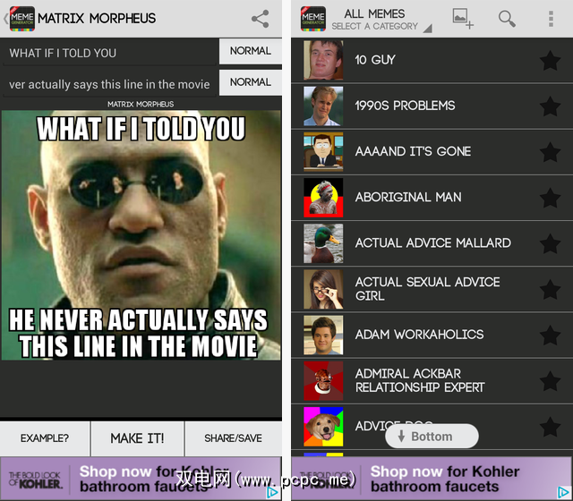 此Morpheus meme实际上是一张稍有不同的图片,但是无论如何,该图片都比其他两个应用程序大得多。 Meme Me似乎通常会制作更大的图像。结合可自定义的文本选项,这使其成为一个有吸引力的应用程序。尽管如此,我发现Meme Generator使得浏览流行的memes更加容易,并且拥有更好的用户界面。