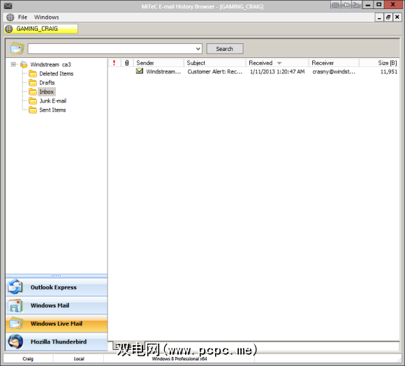 您会注意到上面的屏幕截图有点空白。我不经常使用Windows Live Mail,当我这样做时,它是为我的Windows Live Mail帐户(@ live.com)使用的。我相信使用MiTeC的电子邮件历史记录浏览器加载@ live.com / @ hotmail.com地址时,Windows 8存在兼容性问题。