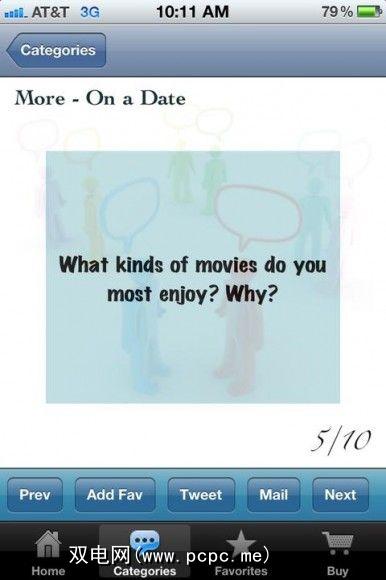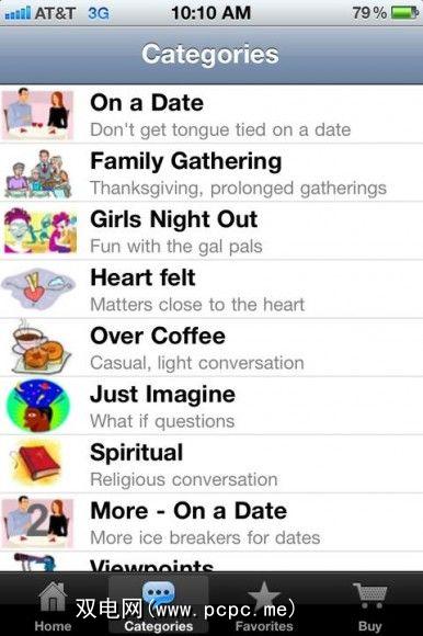 此应用将他们的主题归类。类别通常基于您要进行对话的位置,例如约会或晚宴。在免费版本中,每个类别都有10个主题,并且有10个类别。快速列表告诉我免费版本中有100个对话主题。如果您正在寻找更多产品,则可以支付0.99美元升级到高级版本。这样可以增加900个主题,涵盖各个类别。