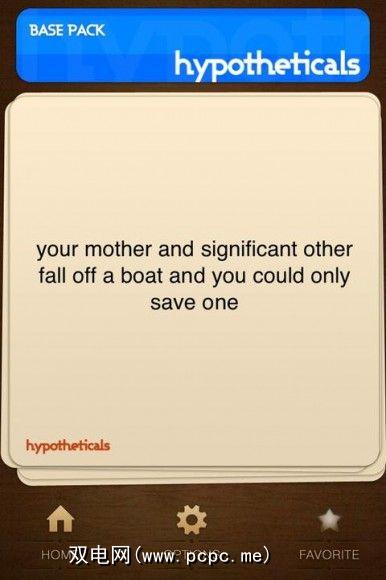 该应用程序的免费版本随附两个包,基本包和WTF包(关于杀害妈妈的示例来自WTF包)。通过将应用程序链接到您的Facebook帐户,可以获得奖励包。链接该应用程序还允许它在墙上张贴假设的情况,这可能会引起朋友的一些有趣的评论。