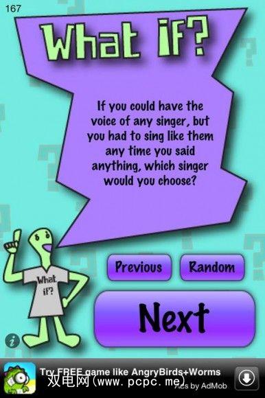 顾名思义,此应用程序会创建假设的情况进行讨论。例如,您是想杀死妈妈还是被妈妈杀死?另一个例子是您是否总是想着自己要尿尿,但实际上不必尿尿,或者永远不知道您什么时候去?