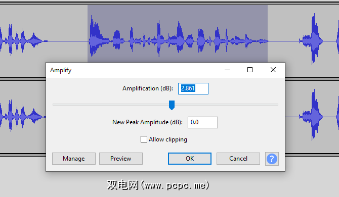 对于我来说,我发现提高5 dB 可以解决问题。一旦知道了正确的值,此修复程序中唯一乏味的部分就是您需要找到音轨中出现安静声音的每个位置,并执行高亮/放大例程以对其进行修复。