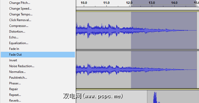 如果有覆盖层,请使用时移工具(双向箭头图标)将音频文件排列为需要。在您要逐渐减弱前奏音乐的位置上,单击鼠标左键,然后选择 Effect> Fade Out 。
