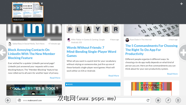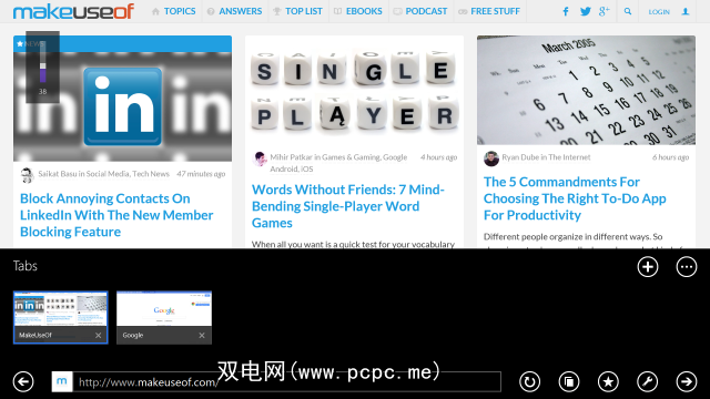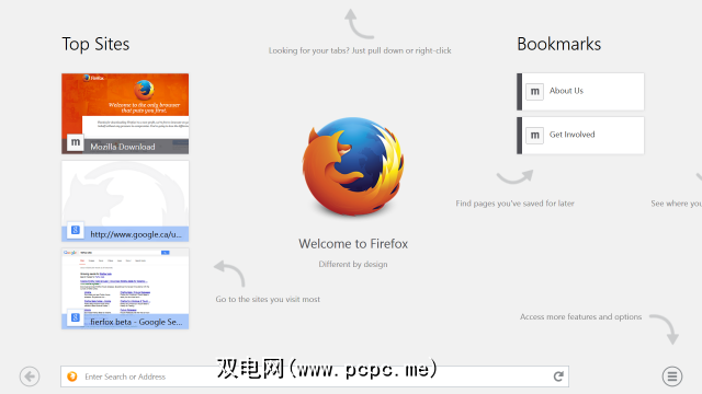 Firefox提供了一个起始页面,其中包含指向您的书签的链接以及最近发布的链接。访问过的网站。与Internet Explorer一样,默认情况下,它以全屏模式显示网页,没有界面。您可以从顶部向下滑动或从底部向上滑动以访问选项卡栏和导航栏,它们在Firefox中是分开的。该界面感觉与Internet Explorer 11非常相似,但它是Firefox。如果您在其他计算机或Android设备上使用Firefox,则特别有用,因为您可以使用Firefox Sync在设备之间同步浏览器数据。