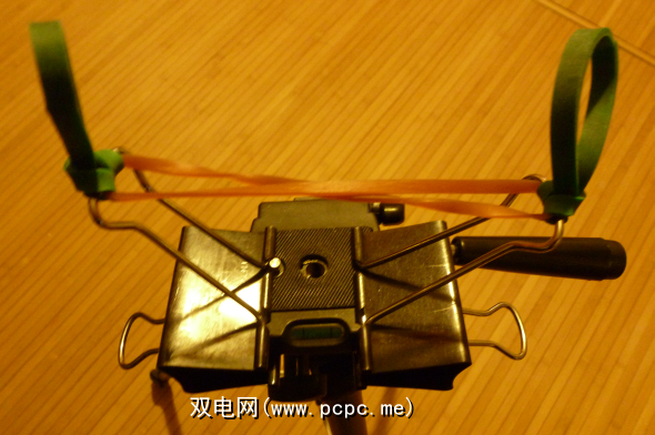 现在将橡皮筋固定在活页夹的手柄上,将您的手机固定到位。我在两端分别使用了两个橡皮筋来固定第三个橡皮筋,该橡皮筋横过三脚架底座。确保中央橡皮筋至少交叉一次。