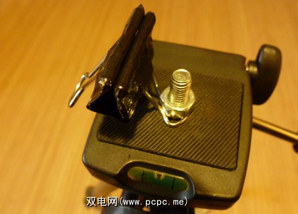 我用布管胶带将装订夹固定下来,以软化边缘并将弯曲的手柄固定到固定夹上。否则在握住智能手机时,夹子可能会翻倒。然后我将夹子拧到三脚架上……