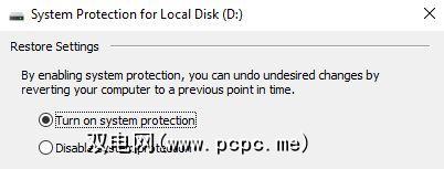 Nothing there? You’ll need to head back to the System Protection options we used earlier. Type system protection into the Start Menu search bar and select Create a system restore point. Select Configure. Under Restore Settings, make sure Turn on system protection is checked.