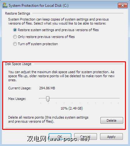 请检查当前的还原点存储分配。 Windows 7不需要像Windows 8、8.1或10那样多的磁盘空间。但是,如果您有足够的空间像许多现代硬盘一样,请考虑从默认的3%增加到5%以上。