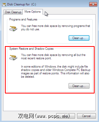 打开更多选项标签。在系统还原和卷影副本下,选择清理。您将看到以下消息: