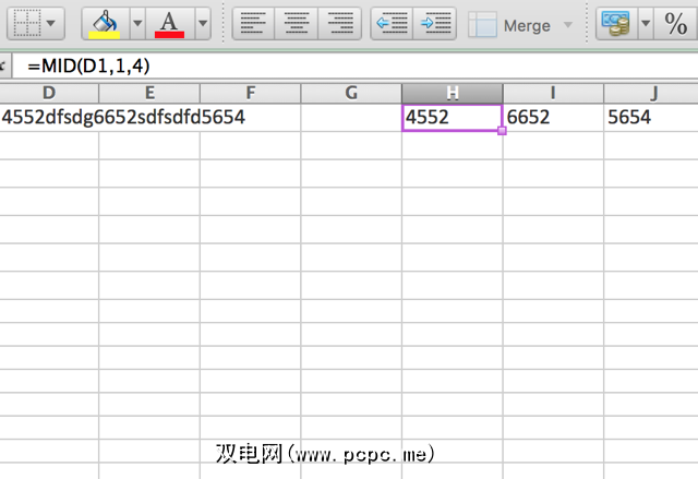 公式很简单,但是如果您不熟悉MID函数,您可能不了解它的工作原理。 MID接受三个参数:一个单元格,结果开始处的字符号以及应提取的字符数。例如,MID(A1,10,4)告诉Excel从字符串的第十个字符开始取四个字符。