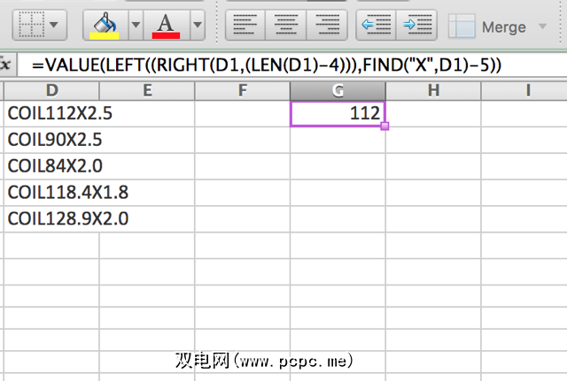 =VALUE(LEFT((RIGHT(A1,(LEN(A1)-4))),FIND("X",A1)-5))让我们从中间开始,并尝试出路,看看它是如何工作的。首先,我们将从查找功能开始。在这种情况下,我们使用的是FIND(“ X",A1)。此函数在单元格A1中的文本中查找字母X。找到X时,它返回它所在的位置。例如,对于第一个条目,COIL112X2.5,它返回8。对于第二个条目,它返回。返回7。接下来,让我们看一下LEN函数。这仅返回单元格中减去4的字符串的长度。结合使用RIGHT函数,我们从单元格中减去前四个字符就得到了字符串,这从每个单元格的开头删除了“ COIL"。该部分的公式如下所示:RIGHT(A1,(LEN(A1)-4))。