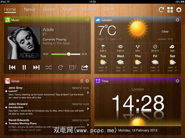 您可以向左或向右滑动小部件的不同屏幕,就像滑动一样通过iPad上的不同主屏幕。您可以自己命名,设置样式并填充这些屏幕,还可以从各种小部件中进行选择,包括:RSS,Facebook,Twitter,日历,YouTube,照片等。