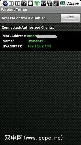 请记住,您必须扎根,并且很可能还必须安装一个新的ROM,例如cyanogenmod(Droid我最喜欢的DROM),该ROM支持netfilter(iptables)才能正常工作。但是,一旦您点击该绿色图标,您的手机就会立即开始通过Wi-Fi或蓝牙传输其蜂窝Internet连接(3G等)。这是我的PC已连接。