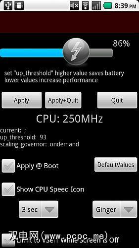 安装并运行该应用程序时,它将以大字体显示当前CPU速度。屏幕。将蓝色条向左滑动以使您的Android超频并提高性能,或者向右滑动以降低速度并节省电池电量。只需将其稍微向右更改,就可以大大延长电池的充电时间-令人印象深刻。