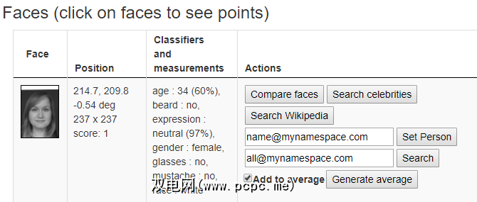 接下来,您可以为每个识别出的面孔比较面孔(与您上传的其他图像),搜索名人或搜索维基百科。结果将显示在人脸识别匹配项表中。