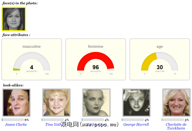 出于演示目的,我使用了自己的头像。当PicTriev正确地将我识别为绝大多数女性时,排名第一的是Jason Clarke。然而,年龄估计值30却非常讨人喜欢。