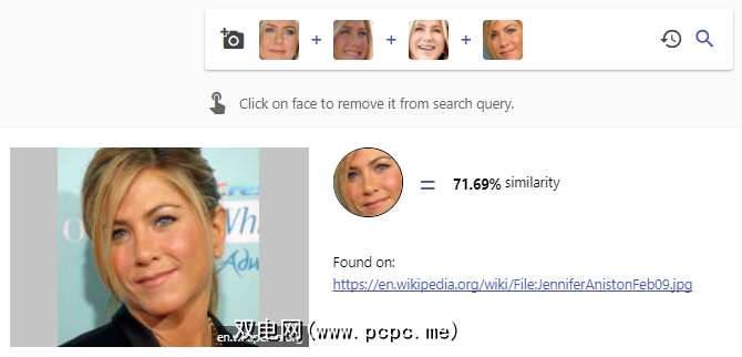 例如,您可以一次使用四张不同的照片搜索詹妮弗·安妮斯顿的面孔。 PimEyes会找到原始照片以及Aniston的其他照片。