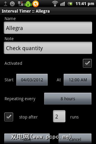 在开始时,您可以创建两种类型的计时器-间隔计时器(基于剂量之间的时间间隔)和“每日时间"计时器(基于时钟时间)。上面的屏幕截图基于间隔时间。时间选择器很酷,尽管该应用程序为您提供了一个默认选项,供系统默认使用。