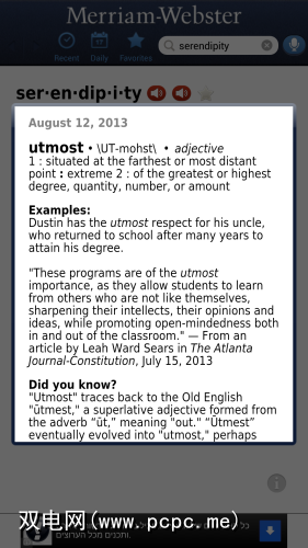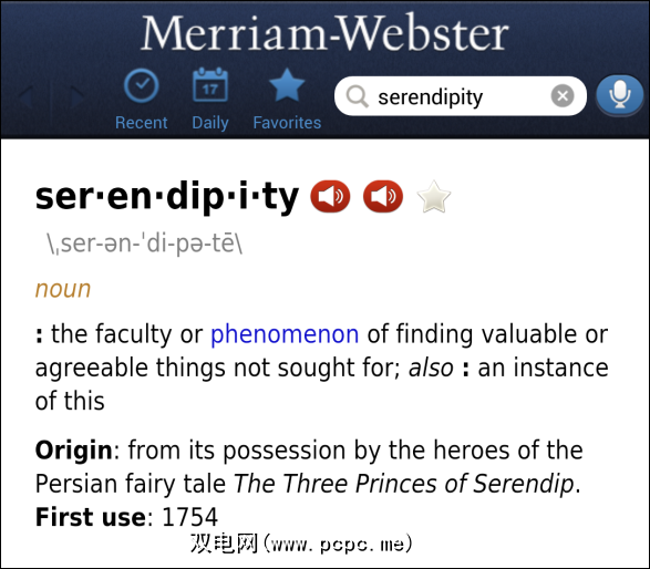 Merriam-Webster几乎不需要任何介绍。它起源于19世纪初期(准确地说是1828年),是最受尊敬和信任的英语词典之一。我已经在两年前审查了用于PCPC.me的Merriam-Webster Android应用程序,此后该应用程序经历了一些细微的视觉变化,但其功能保持不变。换句话说,这是一本非常好的字典: