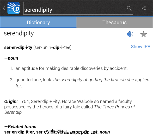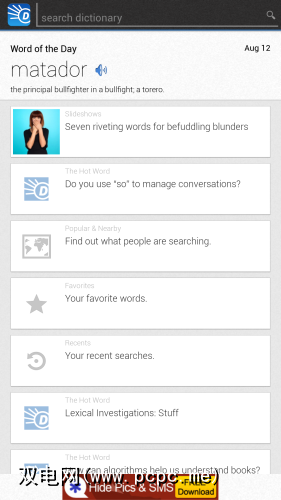 同时Merriam-Webster应用程序肯定有用且权威,它远非现代Android界面设计的缩影。如果您正在寻找看起来更像Holo的产品,则可以很好地查看Dictionary.com应用程序: