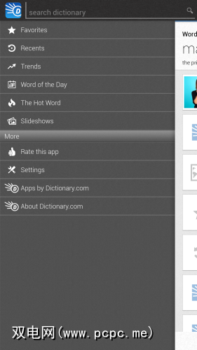 就像在Merriam-Webster应用程序上一样,在Dictionary.com上您可以找到当天的字眼:好。但这只是功能之一:有幻灯片放映,语言博客,检查别人在搜索什么的功能等等。该应用程序还按照其现代形式提供了导航侧边栏: