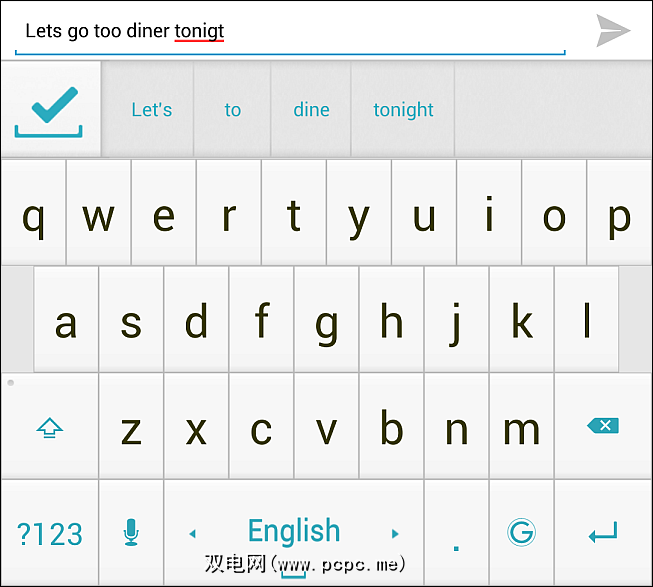 在上面,您可以看到我开始输入的一段短信。 Android的内置拼写检查器捕获了“ tonigt"作为错字,但它漏掉了其他错误。 Ginger做得更好:即使“ lets"和“ too"是英语中的真实单词,它也可以正确地修复“ Let’s"和“ to"。但是,晚餐时它错过了,建议将其固定为“用餐"。不过,所得到的句子(“今晚我们去吃饭")仍然比原始句子更易懂。