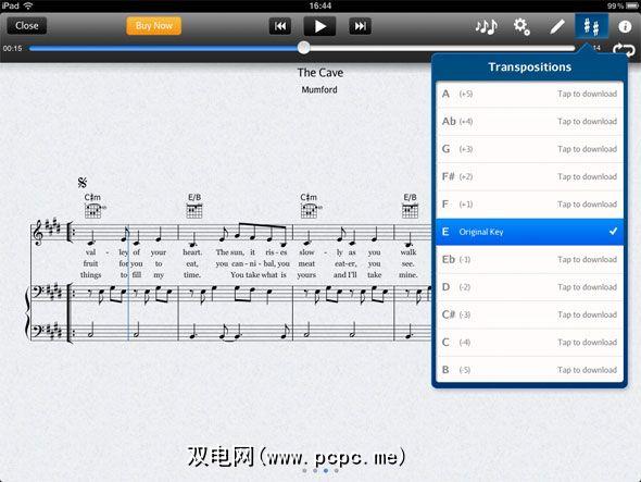 Yamaha NoteStar是一款非常流畅直观的iPad音乐应用程序,带有应用程序内存放作弊音乐。作弊音乐并不便宜,但是您可以对每首歌曲进行采样(通常是前两页)。如果适用,这些歌曲中的每首歌曲都带有完整的人声和打击乐器,您可以打开或关闭它们。更改歌曲的节奏或播放歌曲的移调也非常容易;也就是说,请用其他琴键弹奏。