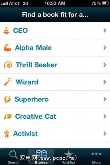 BookYap与Goodreads相似,但缺少书架。他们的推荐引擎虽然很好。浏览屏幕顶部显示“查找适合……的书",并显示了一大堆人。一些示例是CEO,alpha男性,巫师和美食家。还有更多类别,这是一种很酷的方法来缩小数百万本书的范围,并找到与您所要读的书适合的书。