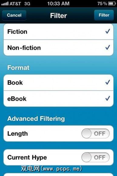 一旦您拥有一本书,您可以单击屏幕右上方的过滤器按钮,并进一步修剪结果。您可以删除一些关键字,并确定是小说还是非小说以及一系列其他参数。
