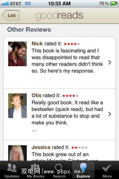 Goodreads是一个很棒的应用程序,用于获取书评和推荐。普通人,而不是傲慢的书评人,留下评论。坦白说,大多数书评家对流行小说的看法都不佳,即使您喜欢阅读它,也可能会发现很难找到没有偏见的专业评论。