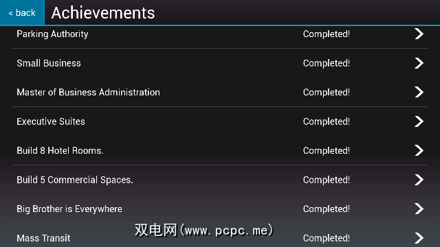 游戏附带一系列成就,其中大部分成就在几分钟之内就很容易实现。它们似乎更像是一种指导性工具:要查看您是否需要建造更多房屋或创造更多就业机会,只需检查您的下一个成就即可。