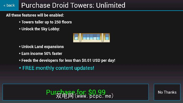 一旦开始构建,您就可以您会意识到,免费版本的层数不能超过15层。如果您尝试这样做,则会弹出以0.99美元的价格购买Unlimited版本的报价。 Unlimited可以启用高达250层的塔楼,解锁Sky Lobby,解锁土地扩展,并使您的收入提高50%。我绝对觉得Unlimited版本是值得的,因为15楼的限制和两侧的土地限制没有给您很大的使用空间。