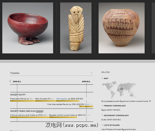 该时间表是历史各个时期的论文,艺术照片和年表的集合。每个部分都有一个概述,一个关键事件列表,一个可滚动的时间轴以及大量与绘画,人工制品和其他艺术品相关的图像。很难弄清有多少可用信息。