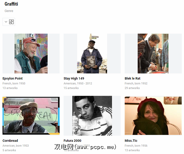 您可以使用左侧面板中的七个过滤器来浏览网站。他们是艺术运动,学校和团体,流派,领域,民族,世纪和艺术机构。