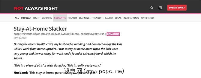 “不总是正确"还拥有一个名为“不总是浪漫"的姐妹网站。再次,它平行于相同的概念。通过“不总是浪漫",读者可以发送自己的故事,详细介绍他们与亲人之间奇怪,另类,古怪或彻头彻尾的奇怪对话。