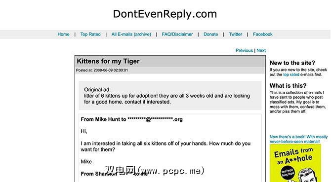 基本上,对于每篇博客文章,网站的作者都会找到一个分类广告,并回复发布者。当原始发帖人做出响应时,博客作者会发回越来越荒谬的答复,直到收件人变得可以理解地生气。您不禁为某些广告主感到难过。