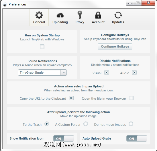 下载TinyGrab之后,请先配置您的热键(全屏,活动窗口或区域)以及在上传时以及上传后执行的操作。这些首选项非常好,很有趣。