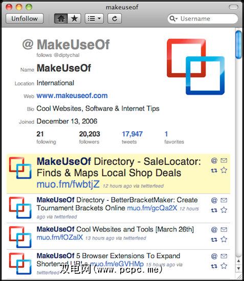 与Itsy相比,HelTweetica提供更多选项的另一种方式是能够在应用程序中查看用户个人资料。点击用户名将打开一个窗口,其中包含用户的个人简介,位置,朋友和关注者的数量,Twitter的加入日期及其最新推文。您还可以在这里关注或取消关注用户。