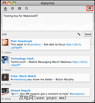 要创建新的推文,请单击小按钮在窗口的右侧,“撰写"窗口将下拉,允许您键入推文。当您不回复推文或发送新更新时,它就会消失。虽然Itsy具有本机网址缩短器,但如果要与关注者共享图像,则必须使用其他客户端。