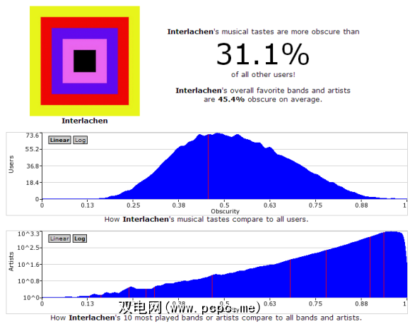 如您所见,最独特的雪花。在页面的下方,显示了一个艺术家列表,其中包含他们各自的晦涩度等级以及您每个人的播放次数。在右侧,提供了代码,以便您可以向世界展示Last.fm个人资料中有多少时髦人士!现在,您觉得特别吗?