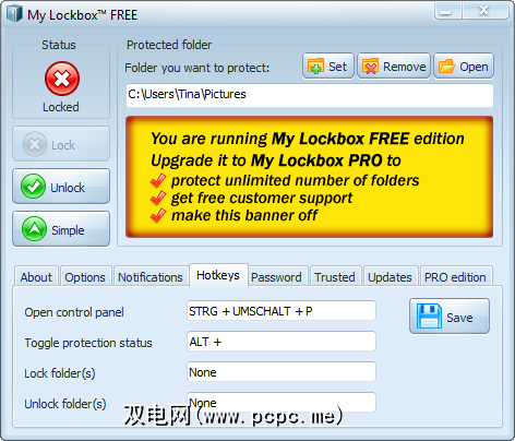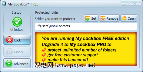 在免费版本中,尽管可以随时更改文件夹,但文件夹的数量限制为一个。启动我的密码箱时,可以锁定(隐藏)和解锁(取消隐藏)您的Lockbox文件夹。与“免费文件夹隐藏"不同,当文件夹选项设置为显示隐藏的文件,文件夹和驱动器时,“我的密码箱"还将隐藏您的文件夹。
