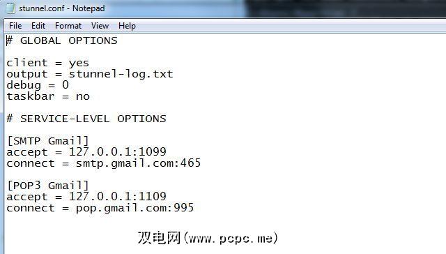 如果要使用Gmail,要做的第一件事就是使用stunnel实用程序设置SSL隧道。对于Windows,下载stunnel安装程序exe文件。完成设置后,进入安装它的文件夹,然后编辑stunnel.conf文件。删除其中的所有内容,然后将其替换为下面的脚本。