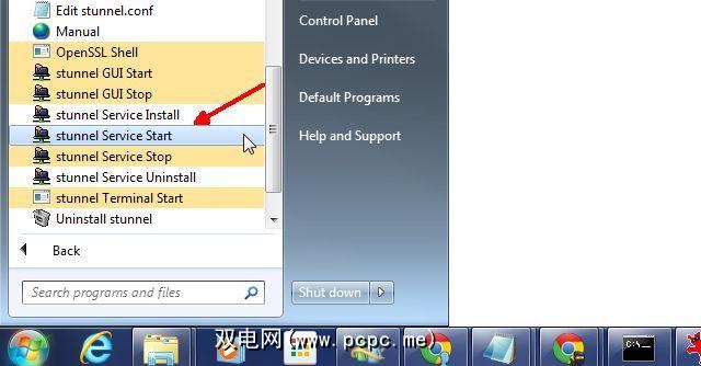 完成此操作后,转到“开始"菜单,找到Stunnel程序文件夹,然后启动stunnel Service Start。
