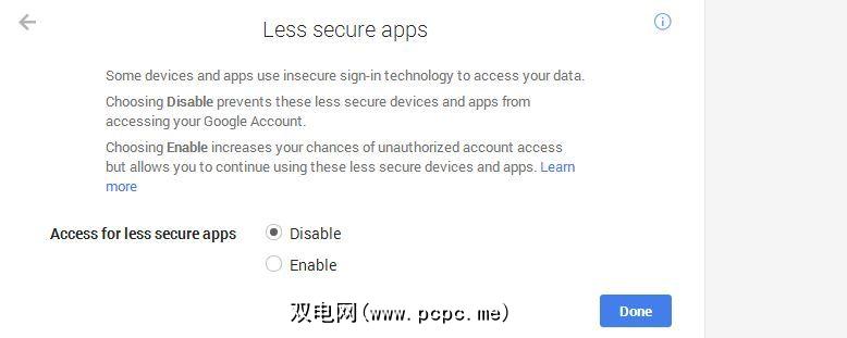 将其设置为“启用"将使隧道能够正常工作。鉴于此,它还会降低您Gmail帐户的安全性,因此请谨慎使用。为了方便起见,这里需要权衡安全性,因此您必须做出对您来说更重要的选择。