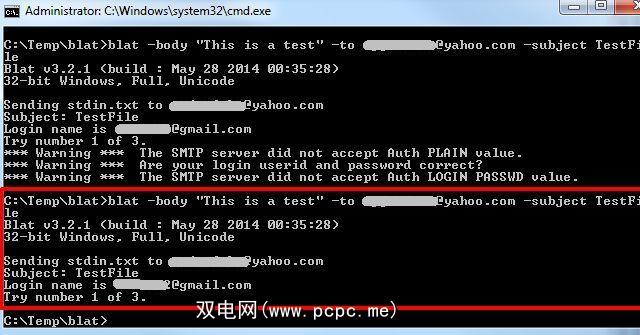 现在,您可以设置Blat。只需解压缩下载的三个Blat文件,打开命令提示符,然后转到该目录即可。使Blat允许您通过键入以下命令来命令发送消息(用您自己的凭据替换电子邮件,用户名和密码)。
