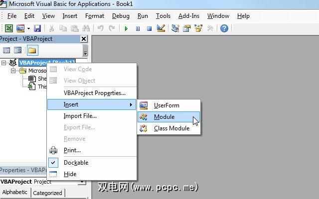 其工作原理如下。打开Excel后,按Alt-F11打开VBA编辑器。右键单击VBAProject,创建一个新模块,选择“插入",然后选择“模块"。