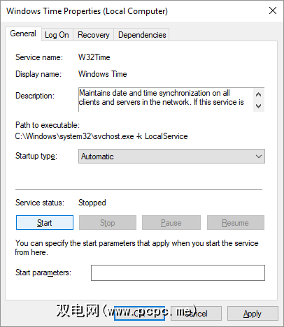 在Windows时间属性窗口中,将开始类型设置为自动。然后单击开始以确保该服务正在运行,然后单击确定保存更改。