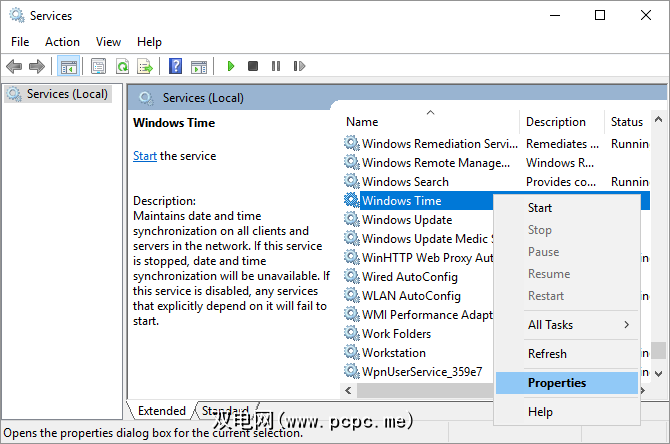 要确保Windows同步时间,请按 Windows键+ R ,输入服务。 msc进入``运行''菜单,然后按 Enter 。在“服务"窗口中,在“名称"列中找到 Windows时间,右键单击它,然后选择属性。